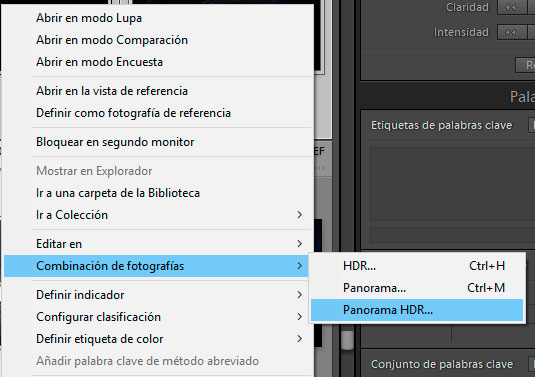 Para hacerlo funcionar, debemos seleccionar nuestros RAW (Todos, los del HDR y los de la Panorámica) y pulsar botón derecho del ratón > combinación de fotografías > Panorama HDR: