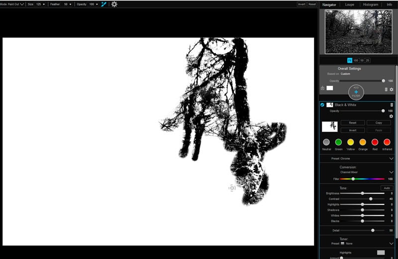 En esta imagen hemos añadido un preset de Blanco y NEgro, y vamos a usar la máscara rápida para enmascarar el cielo - Máscaras complejas: incluyen todas las opciones de máscaras de luminosidad que podemos crear en nuestros procesados.