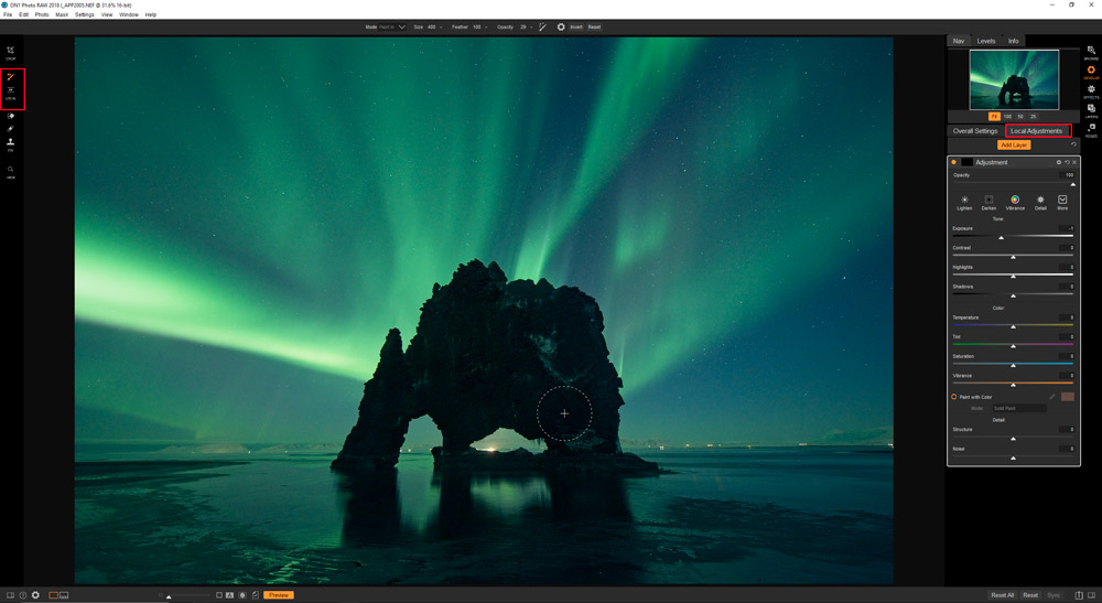 A los ajustes locales se puede acceder de dos maneras, la primera y más intuitiva es directamente pulsar en la pestaña de ajustes locales. La segunda es directamente pulsar bien en el botón “Local” o en el botón del pincel de ajuste ambos situados en la barra de herramientas de la izquierda.