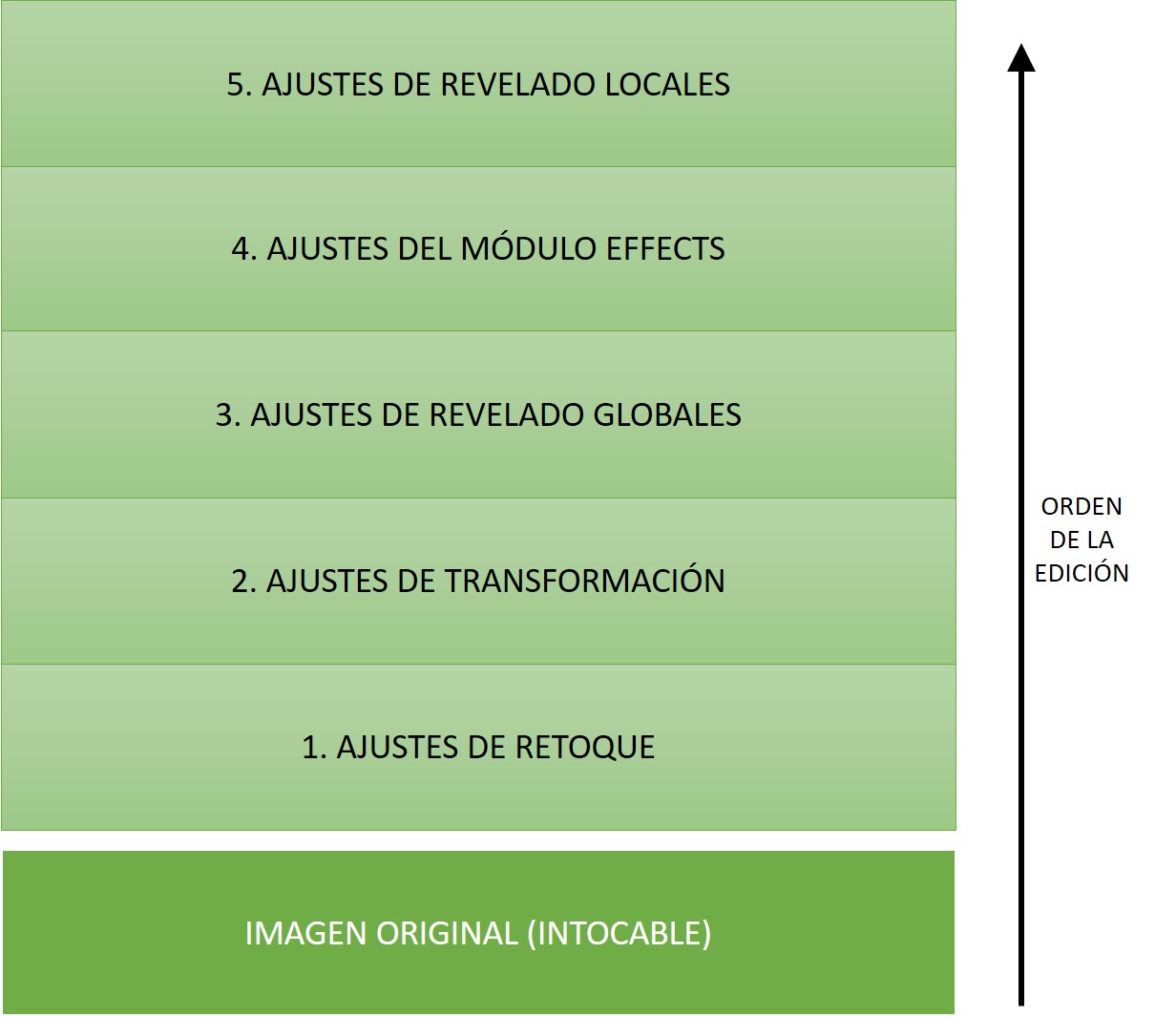 Como os he comentado no es obligatorio que nosotros sigamos este orden de ajustes, pero si conviene conocer que este es el orden en el que ON1 PhotoRAW va a ir aplicando los ajustes cada vez que abramos un archivo Raw.