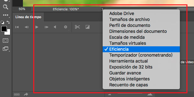 Para ver cuando estamos en esta situación, debemos activar el indicador de eficiencia, y poder ver qué tal está trabajando Photoshop. Si el indicador de eficiencia es del 100% eso es que la RAM está haciendo todo el trabajo (buena señal), cuando empezamos a bajar de porcentaje, indica que se está empezando a usar memoria virtual (no tan buena señal). Por lo tanto, si nuestro indicador de eficiencia nunca baja del 100% no tiene sentido invertir en discos de estado sólido (SSD) para configurarlos como discos virtuales. Sin embargo, cuanto menor sea el indicador de eficiencia en nuestros procesados mayor será la mejora a la hora de utilizar SSD como disco virtual.