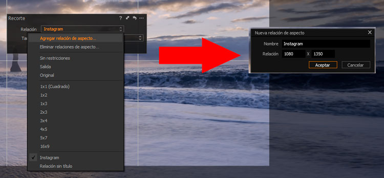 También puedes añadir proporciones de recorte personalizadas directamente desde el menú desplegable que encontramos cuando despliegas “proporción” en el cuadro de diálogo de las opciones de recorte. IMAGEN. Simplemente pon un nombre y selecciona la proporción que desees añadir. Para mí es muy útil añadir una para instagram con las proporciones que se utilizan en las fotografías verticales de la red, que sin duda son las que más interacción reciben. (1080×1350) ![]()