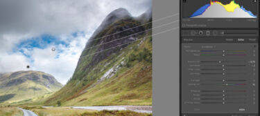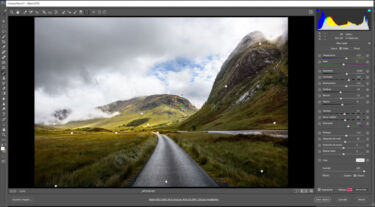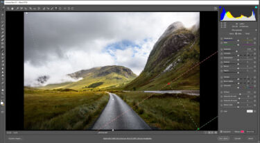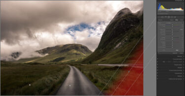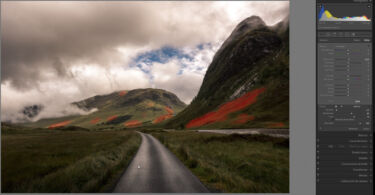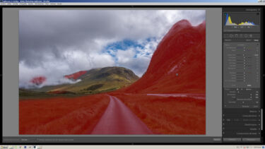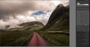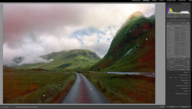 | Primero en CR he ajustado hasta que me ha gustado la foto. He añadido 2 filtros radiales a ambos lados del camino para dar luz a la hierba y otro en la montaña del fondo para lo mismo. Degradado para dar protagonismo a las nubes. |