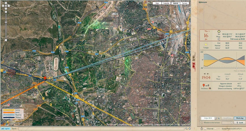 En la parte inferior podemos visualizar la evolución de la trayectoria del sol y de la luna a lo largo del tiempo. Además, si desplazamos la flechita del horario que está debajo del gráfico, en el mapa nos indicará con una linea gris claro, el trazado de la dirección de la Luna, e incluso su elevación sobre el horizonte.